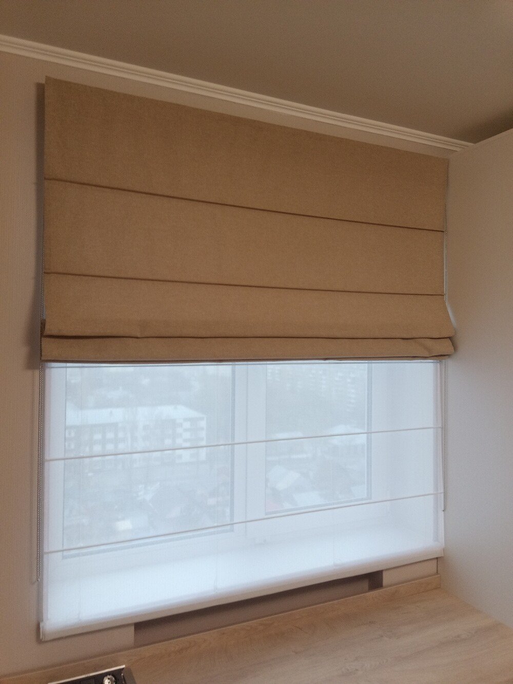 Римские шторы День-Ночь — система из двух отдельных полотен: полупрозрачный тюль для рассеянного света днем и плотная ткань (блэкаут) для затемнения ночью. Управление полотнами независимо друг от друга для максимальной регулировки освещенности и приватности.